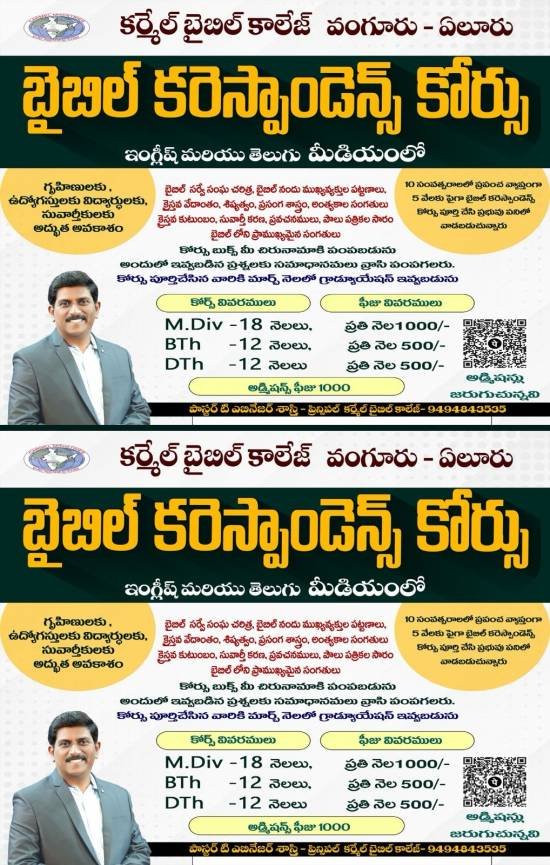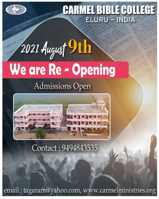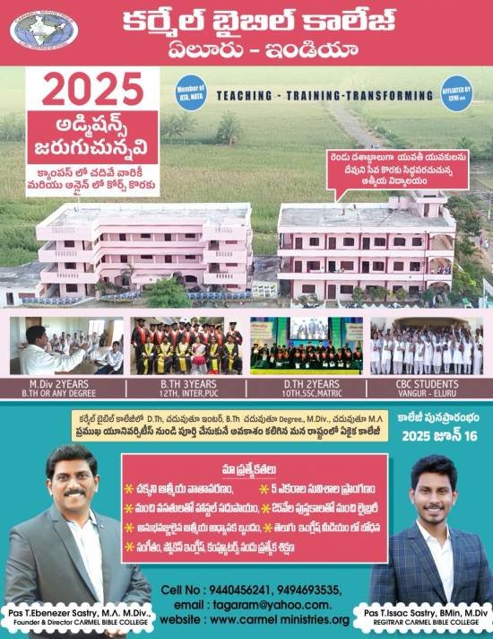 Carmel Ministries was birthed out of prayer and vision gave by God to reach the unreached and save souls from eternal separation from God through Jesus Christ. It started in ELURU-India in 1996 and later it was registered with like-minded people under the Societies Act in India as a charity, Register No. 374/02. Our central office is in Eluru. Carmel Ministries is a faith-based organization with a focus to proclaim the gospel through word and deed to whom it matters most. Jesus said in Matthew 25:40, "Assuredly, I say to you, in as much as you did it to one of the least of these My brethren, you did it to Me", and to be about the work of our Lord is the heartbeat of Carmel Ministries. We are a Bible-believing, Jesus-loving, Christ-centered, and mission-oriented ministry.